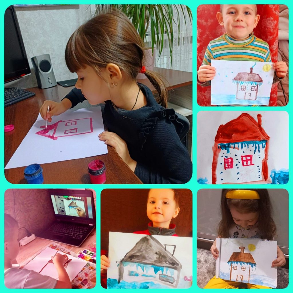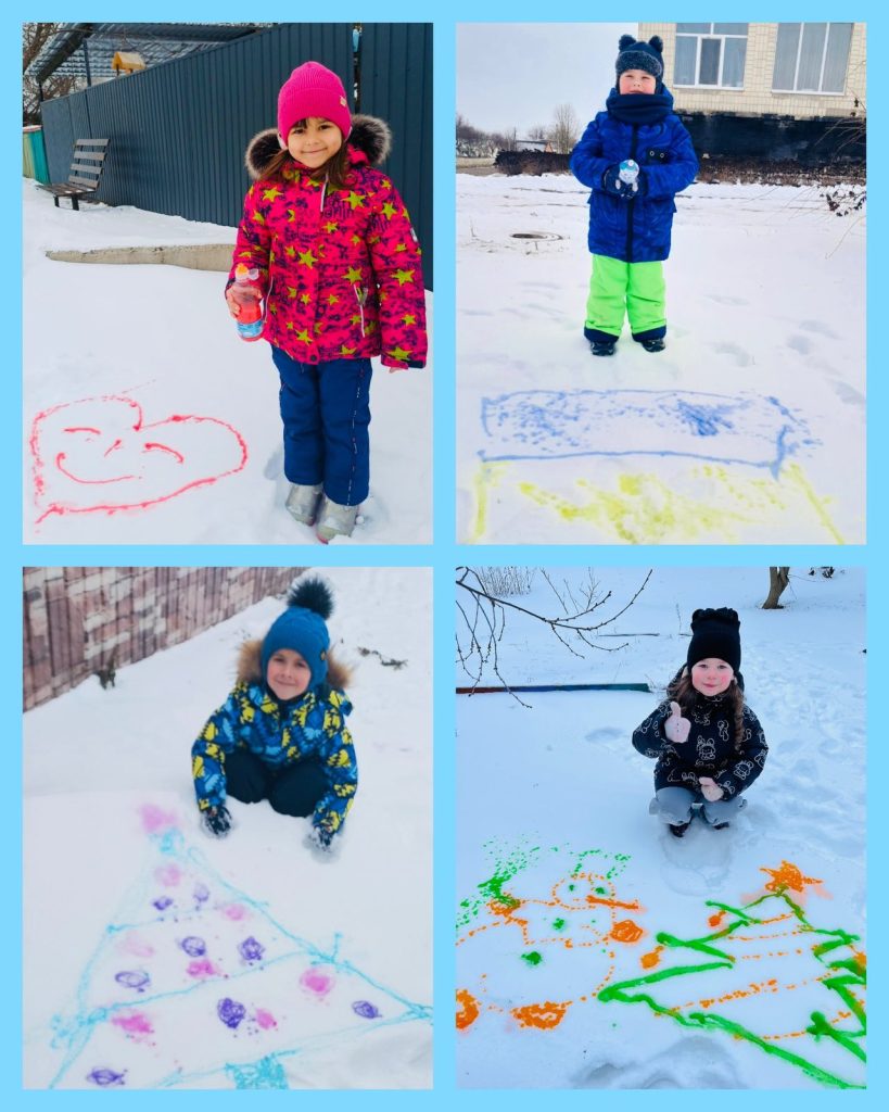- Творче завдання: Отримавши відеоінструкції, діти готували «чарівну воду» (підфарбовану фарбами) та перетворювали сніг на подвір’ї у яскраві шедеври. На нашому сайті тепер красується ціла фотогалерея дитячих робіт, надісланих батьками.